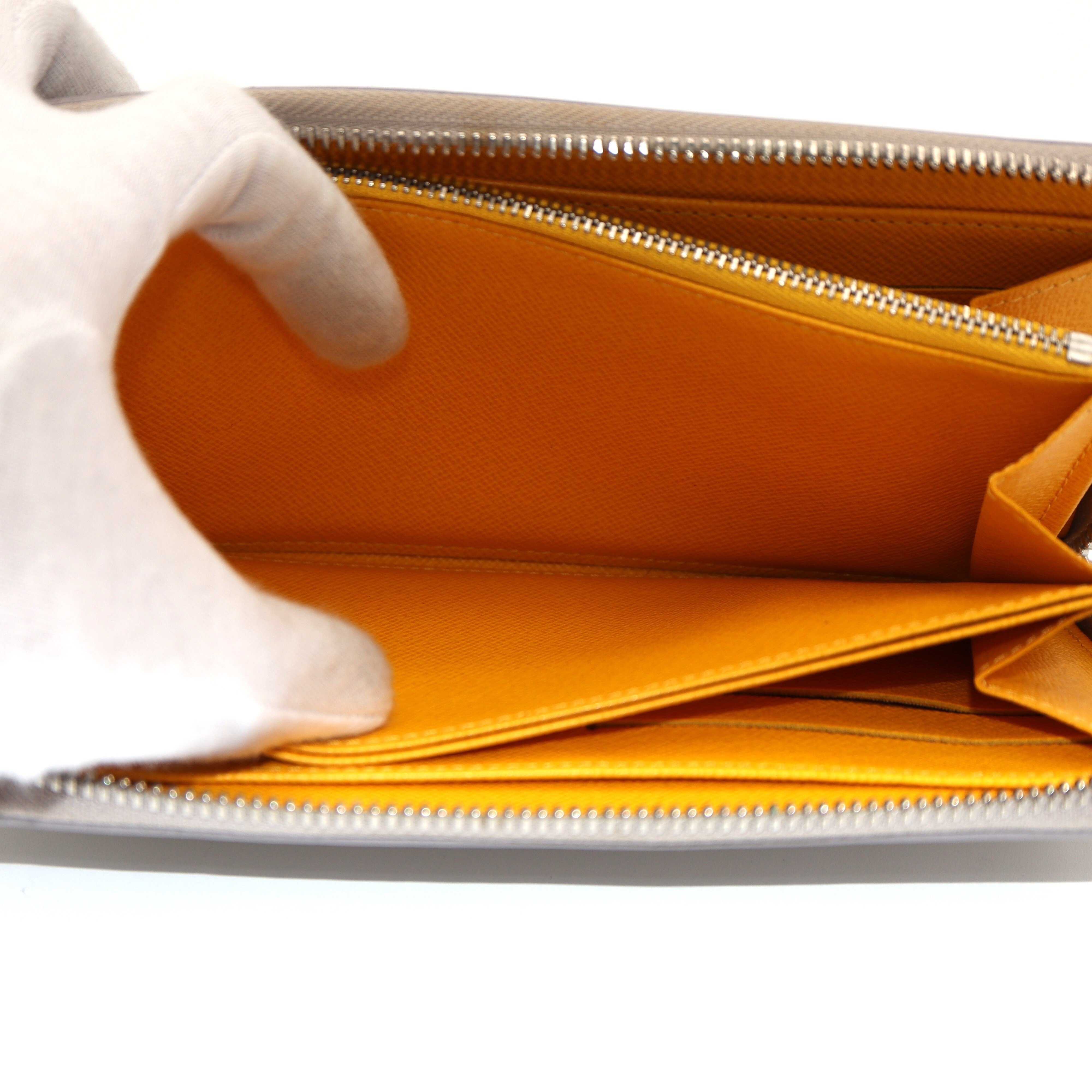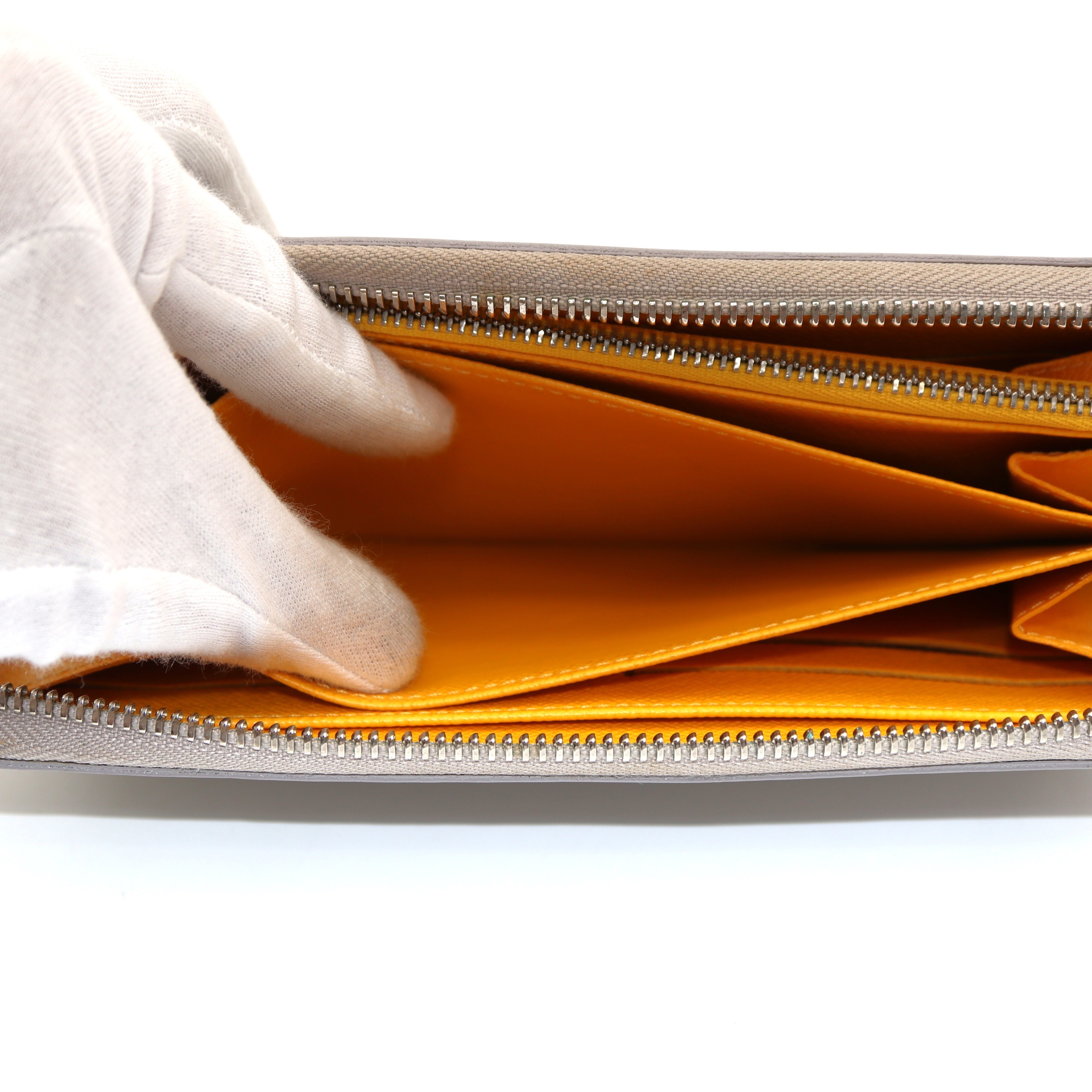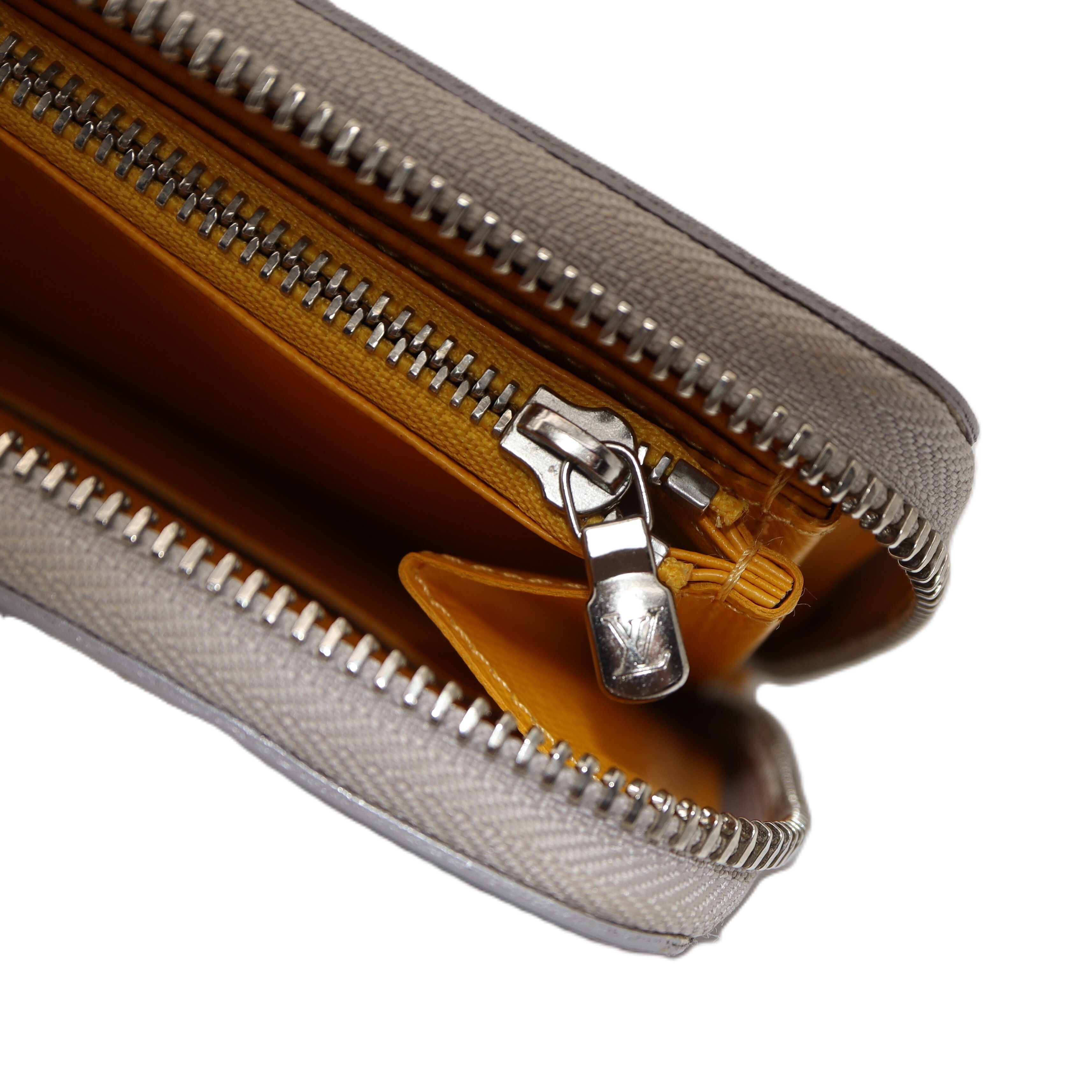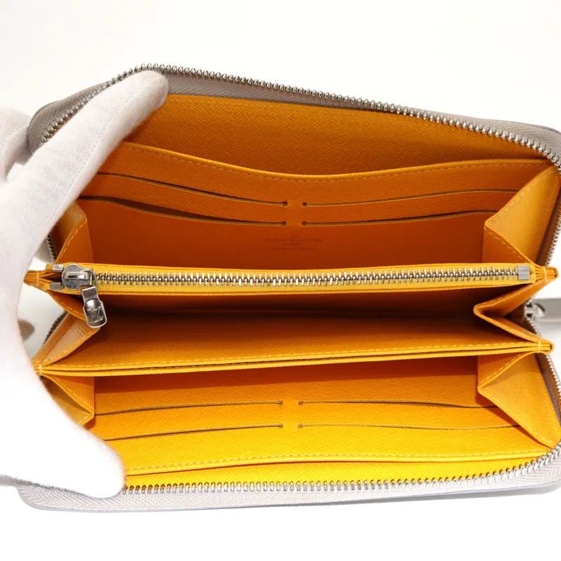 Ranking : B Colour : Grey X Yellow Size : W19.5 X H10.5 X D2 cm Model : M6007J Material : EPI Leather Remark : Outside scratches, metal frayed, Coin case wears