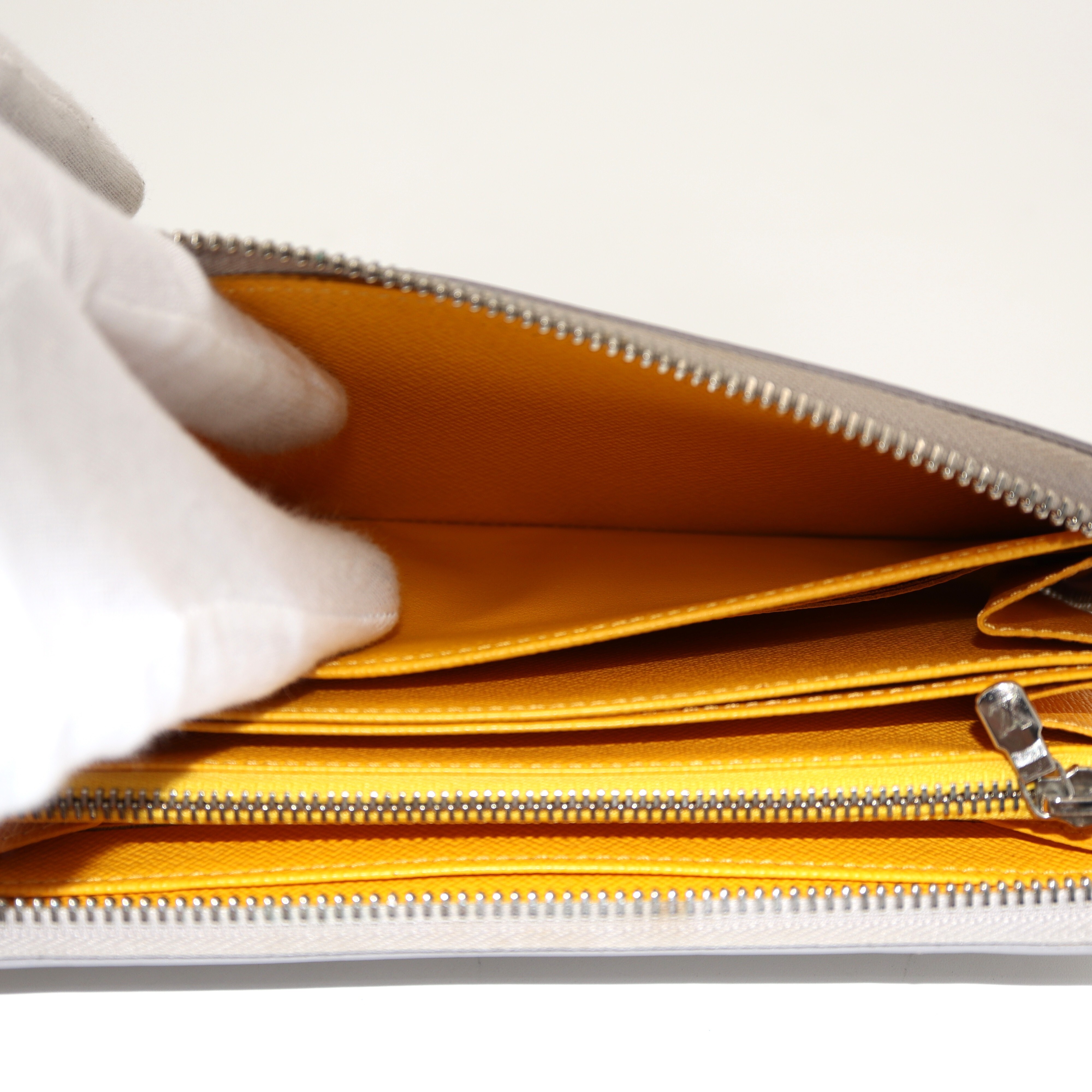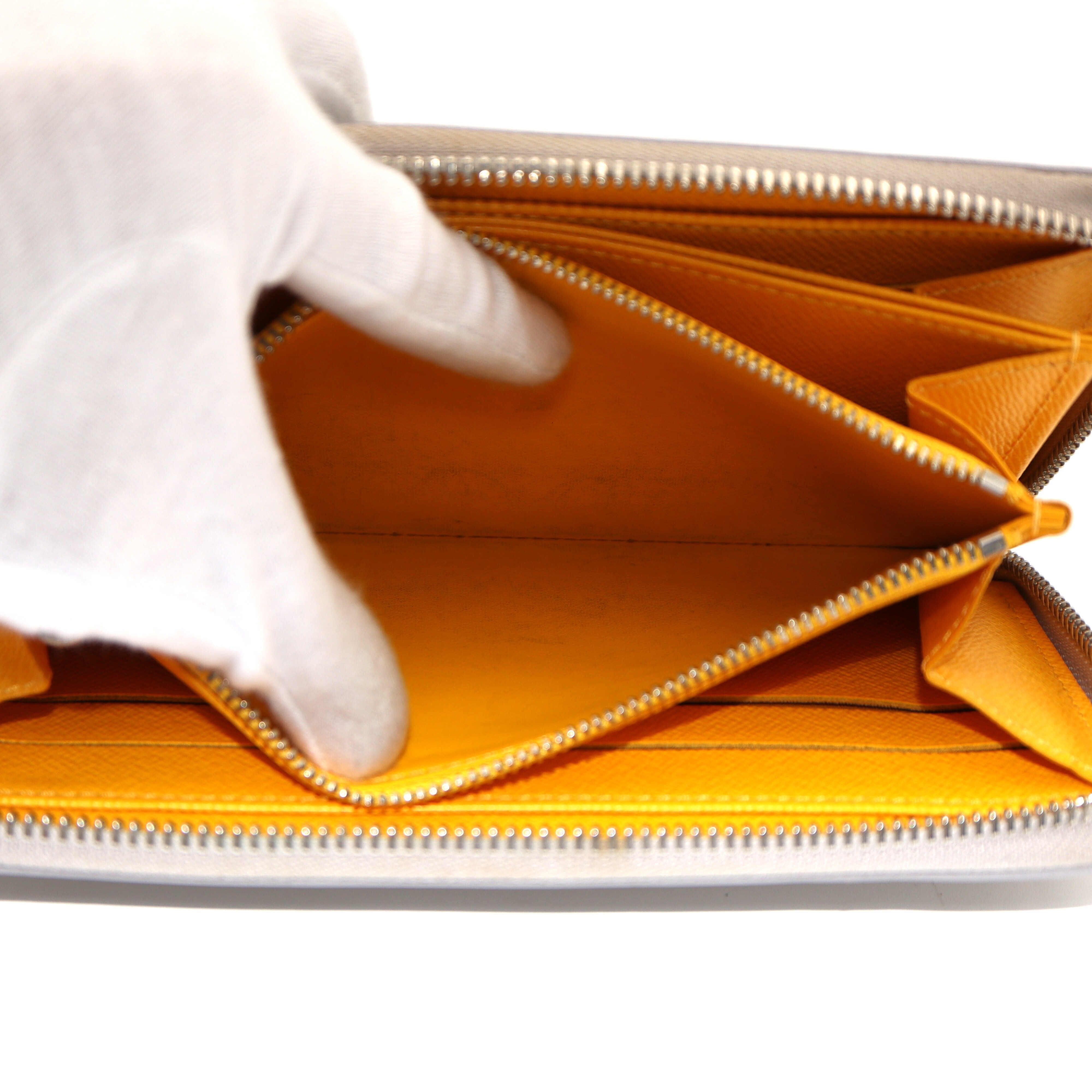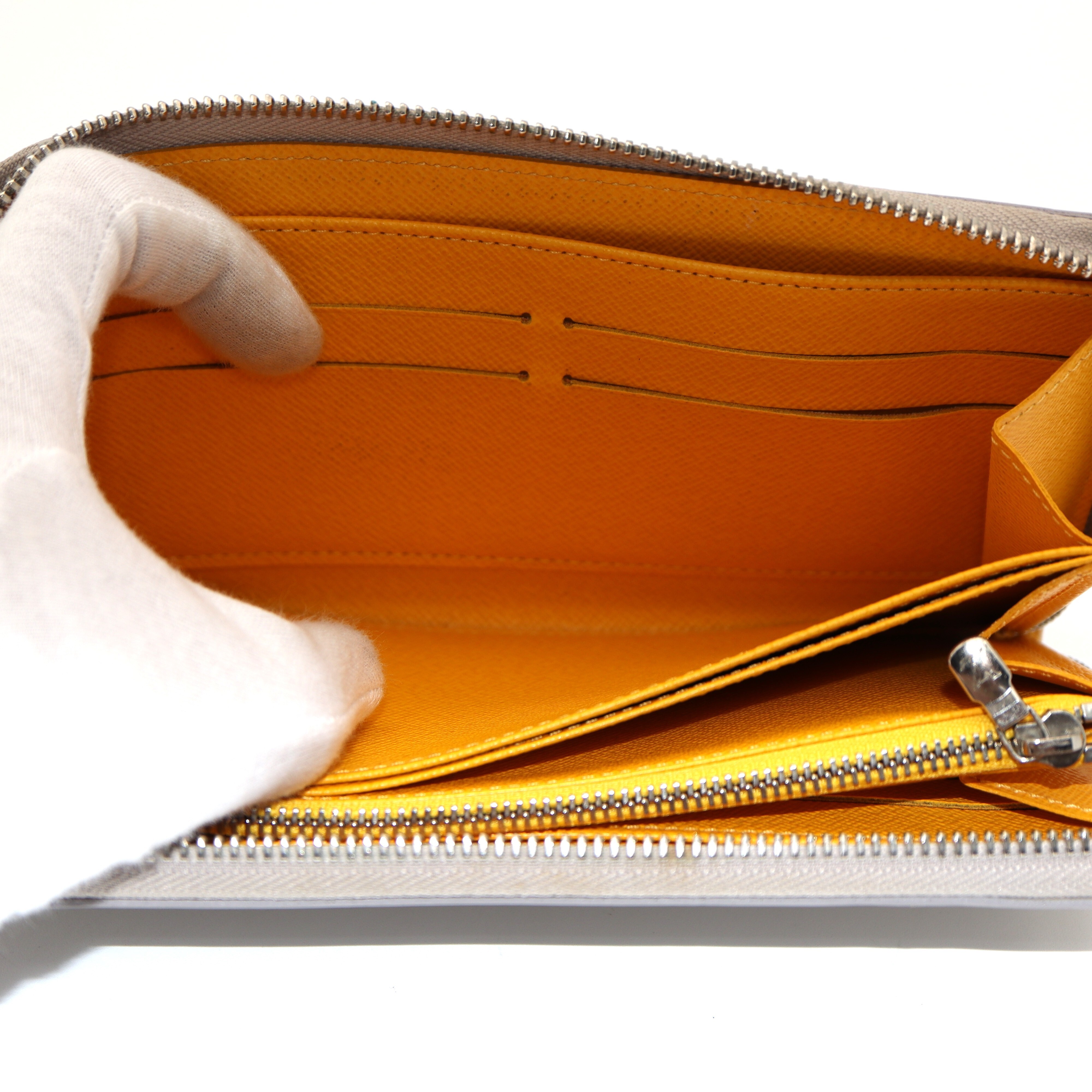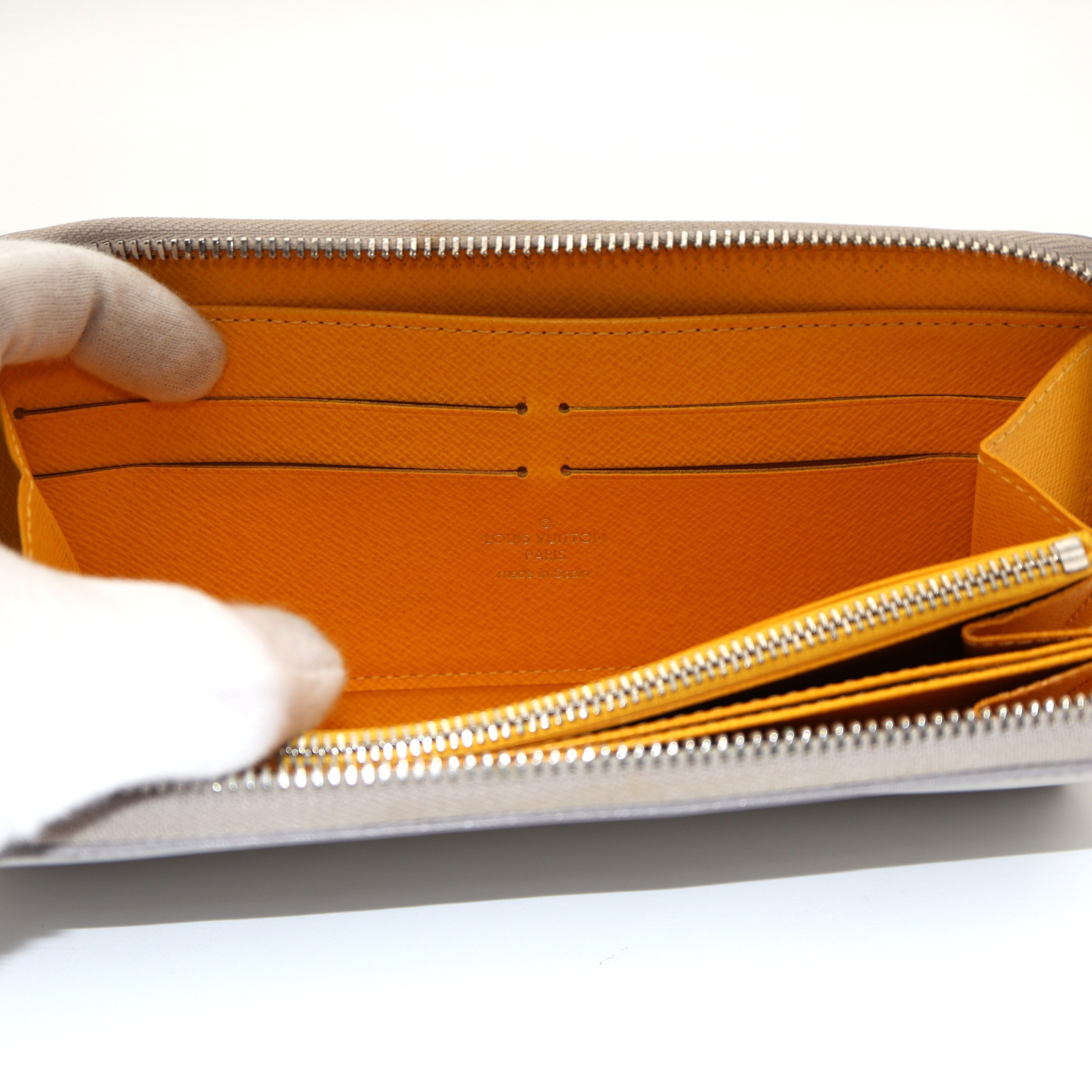 Ranking : B Colour : Grey X Yellow Size : W19.5 X H10.5 X D2 cm Model : M6007J Material : EPI Leather Remark : Outside scratches, metal frayed, Coin case wears